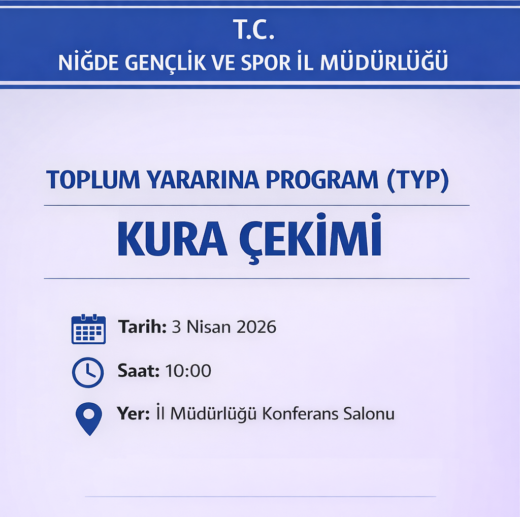 3 Nisan 2026 tarihinde İl Müdürlüğümüz Konferans Salonunda saat 10.00'da Toplum Yararına Program (TYP) Kura Çekimi yapılacaktır.